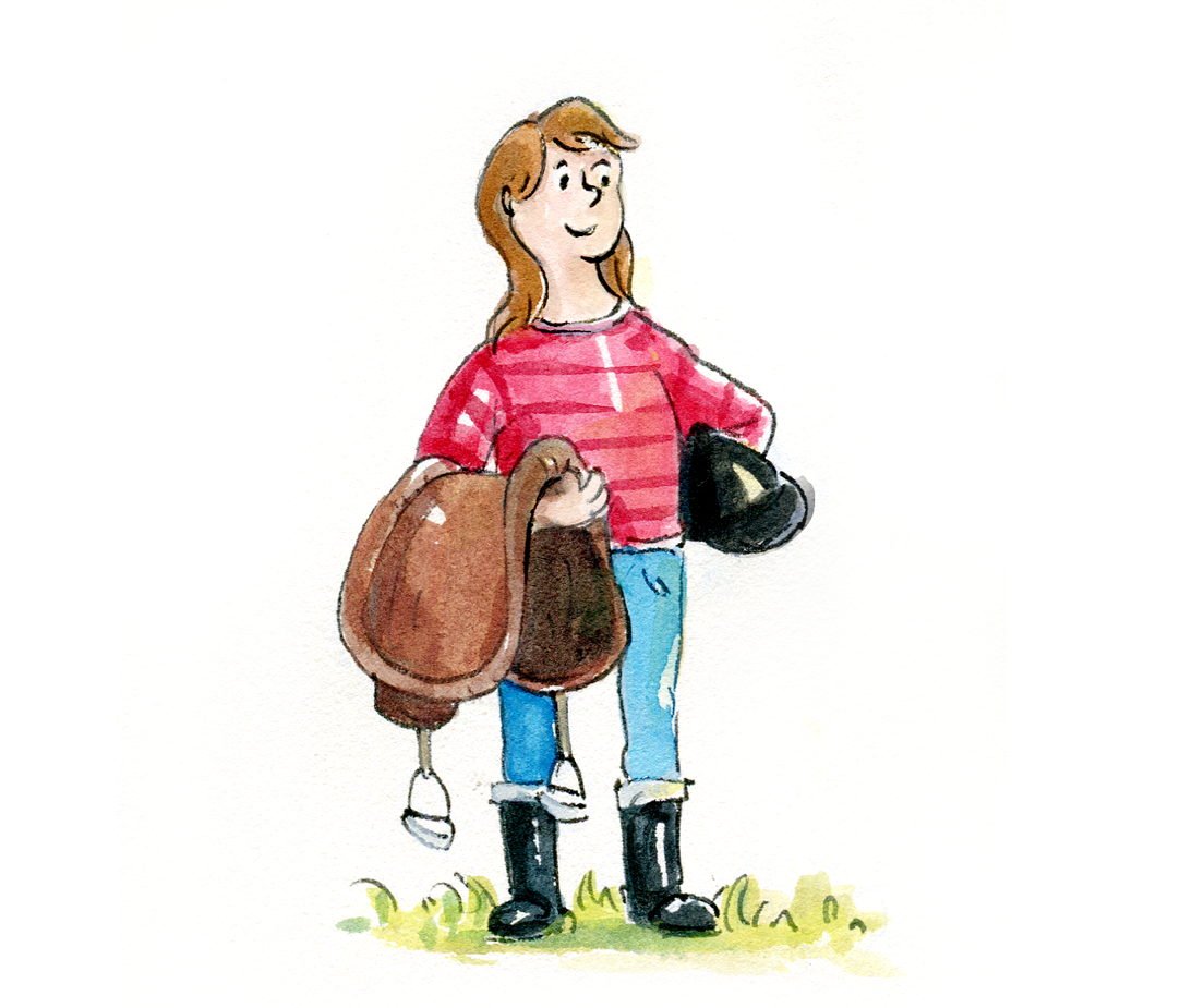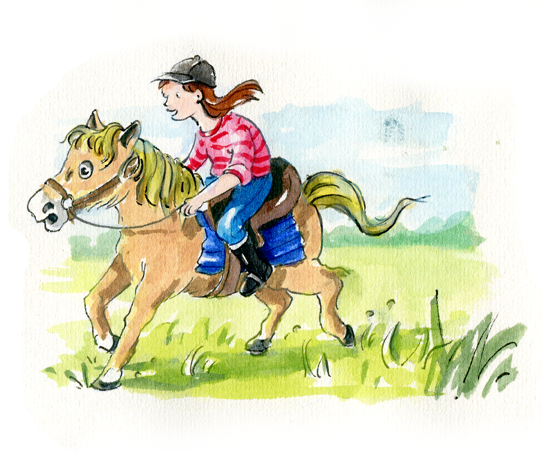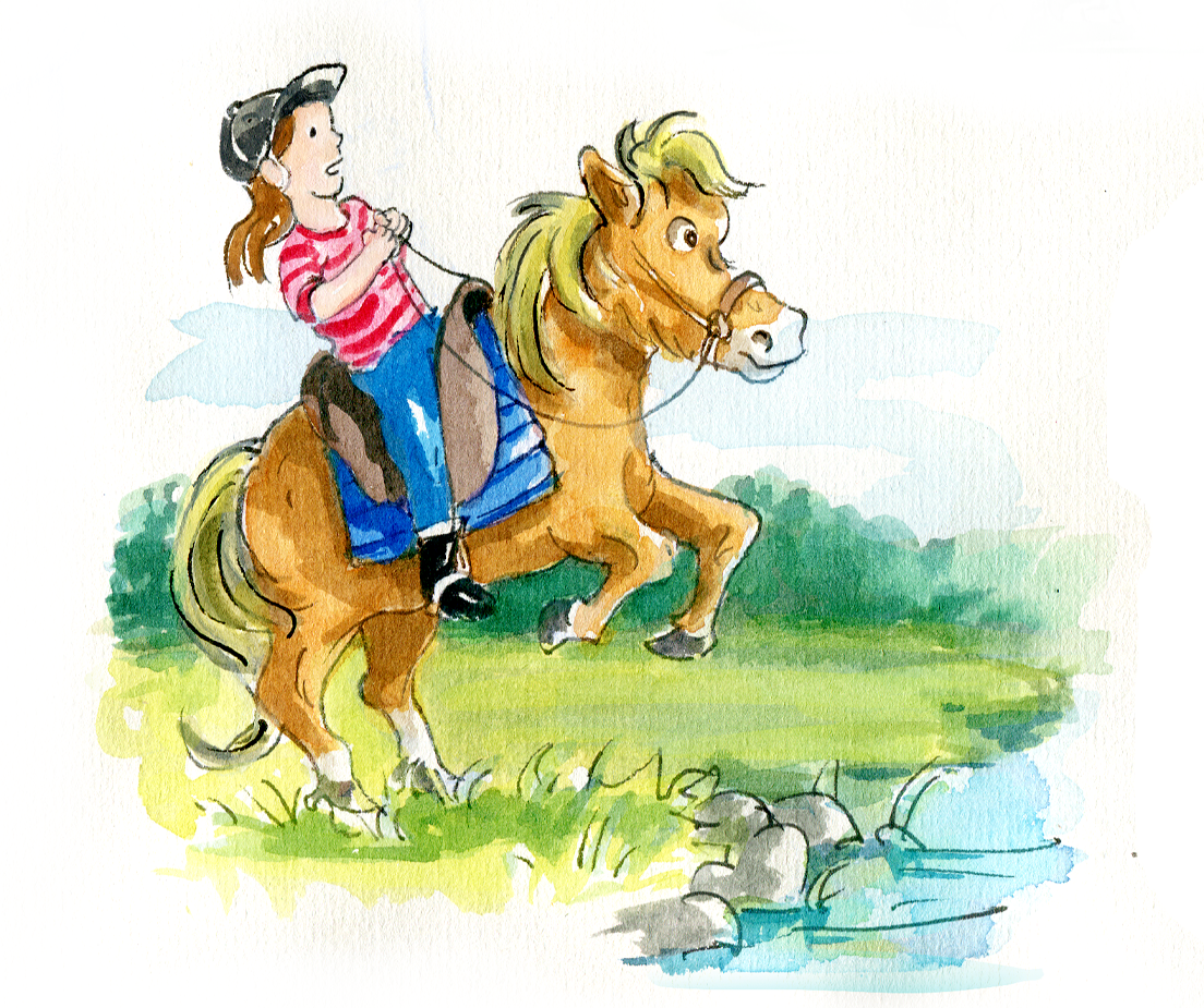 Aquarelle Illustration von einem Mädchen dass einen Ausritt in die Natur macht. Bunte Illustration für Kinder.